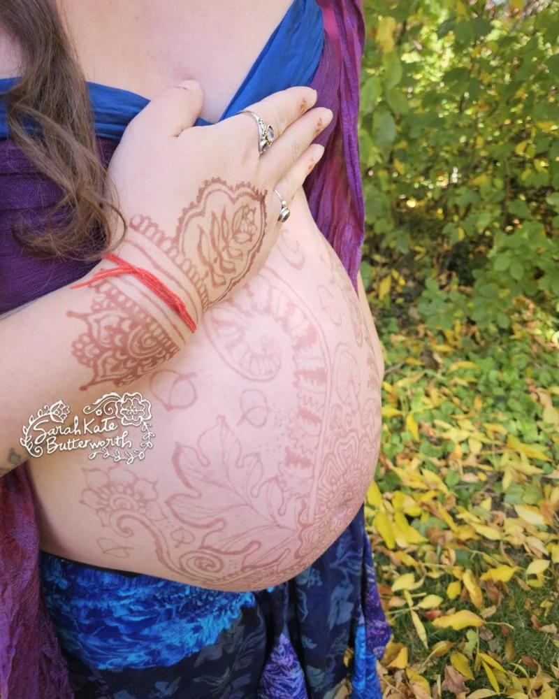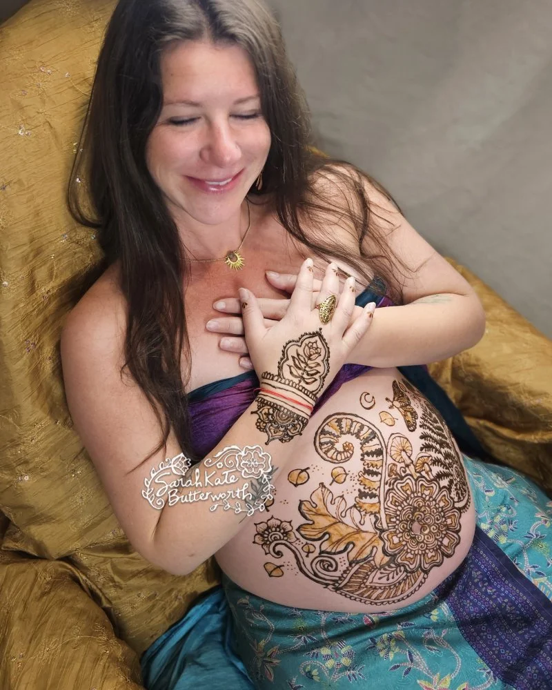 Last September, I met a mama who shared her cherished dream of adorning her pregnant form with the exquisite art of henna, inspired by the countless births she's attended as a doula, where the sight of henna-graced bellies profoundly touched her heart. It’s a beautiful way to honor both the mama and her baby.