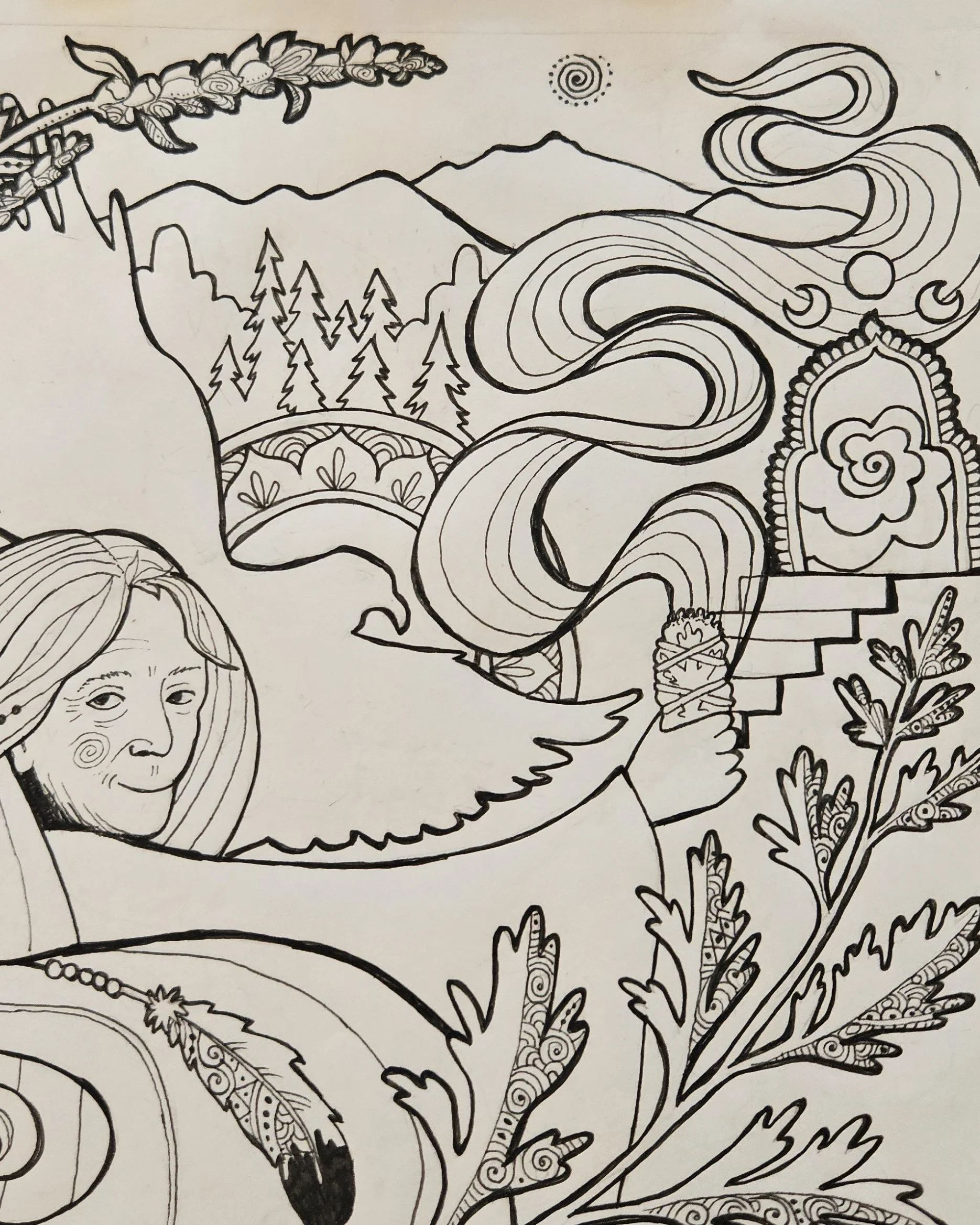 As I sat with my pencil and sketch book, brainstorming ideas for nature scenes, I felt the tug of an animal wanting to be included. First came the eagle, as a kind of silhouette against the mountain. Recently we’ve had some bear activity near our home in Boulder, and I found a bear wanting to be in the sketch. Even a tree found its way in, and I really challenged myself to draw it in a way I've never done before – which was tricky, considering I've drawn hundreds of henna trees!