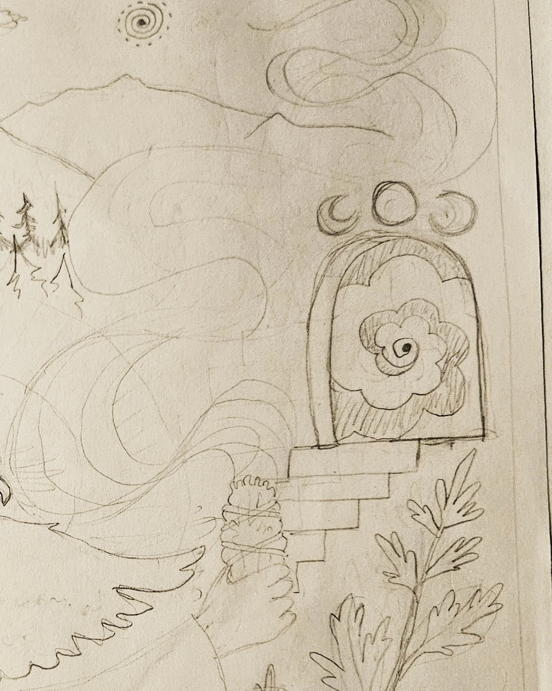 Sarah’s vision for her art arrived in a flurry of screenshots – pieces of my past work she adored, as well as potential elements - trees, mountains, nature, butterflies, birds, and insects. I was sparked by the request for insects and pulled up a sketch I’d done years ago with a little grasshopper with lots of nature elements. She also saw my sketch for the lotus and wanted to incorporate that.